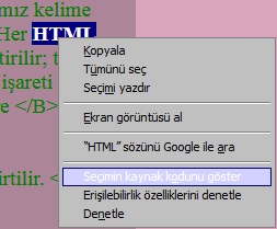 HTML Özel KarakterlerBu web sayfasında dikkatinizi çeken birşey olmalıydı: HTML etiketleri tarayıcı tarafından yorumlanmayıp burada metin içinde gösteriliyor.Bunu & işareti ile ; işareti arasına lt ve gt yazarak elde ediyoruz. Tarayıcı & ile lt ve ; işaretlerini görünce HTML yorumlamayı bırakıyor. Özel karakterlerin web sayfası içerinde görüntülenmesi de aynı yöntemle oluyor; (& ve ; arasına özel karakterin kısaltması getiriliyor.) Bi öğrencim yıllar önce yayını sürmemiş bir sitemdeki özel karakter sayfamdaki kodları CTRL+U ile alıp sayfa yapacaktı. Yapınca buraya linkini bırakırım. |